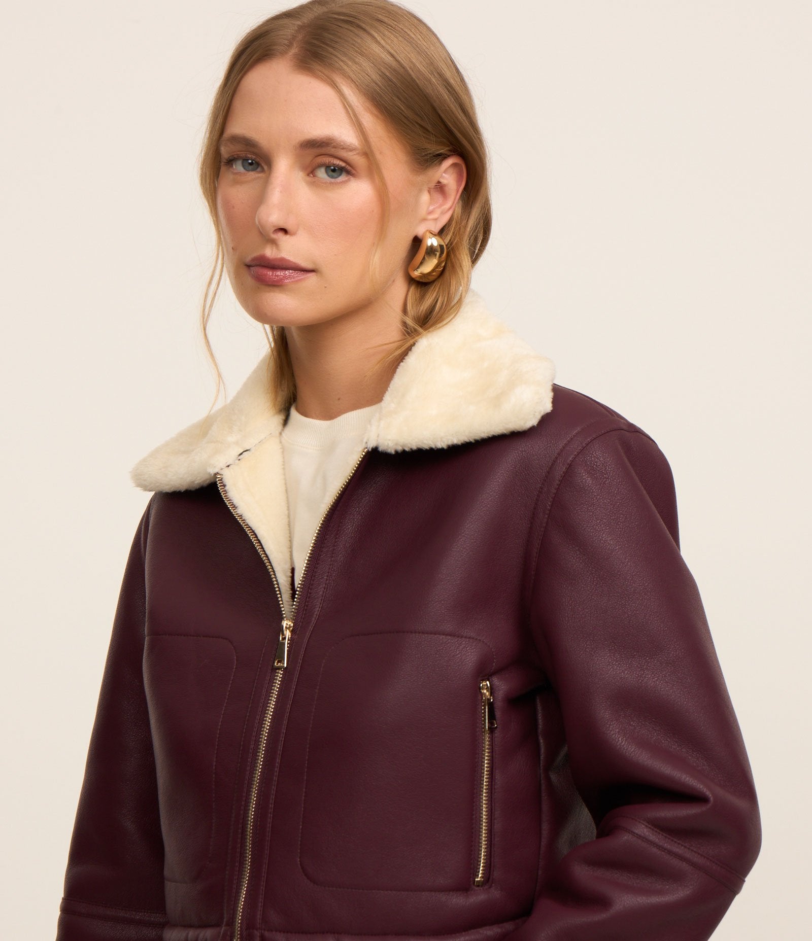 Jaqueta de Material Sintético com Gola e Mangas em Bordô Contrastante