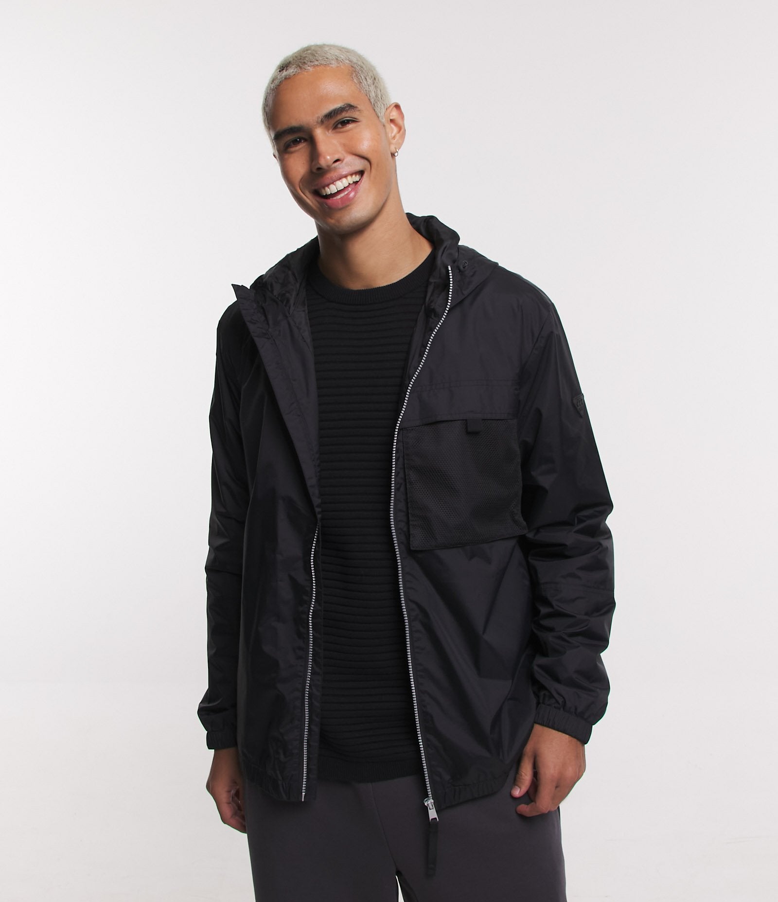 Jaqueta de poliamida com bolso de malha e capuz preto