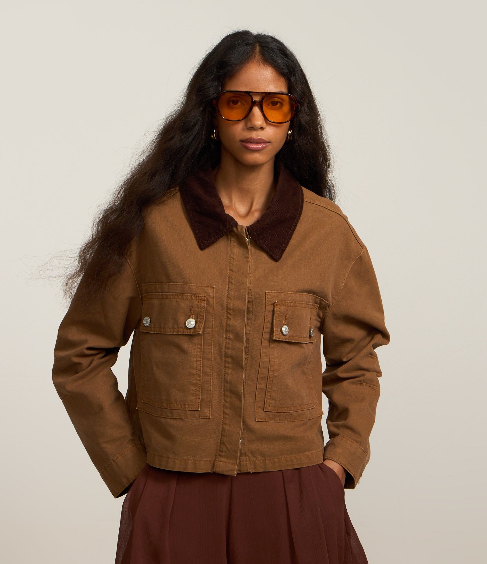 Jaqueta em sarja com gola de veludo cotelê marrom contrastante