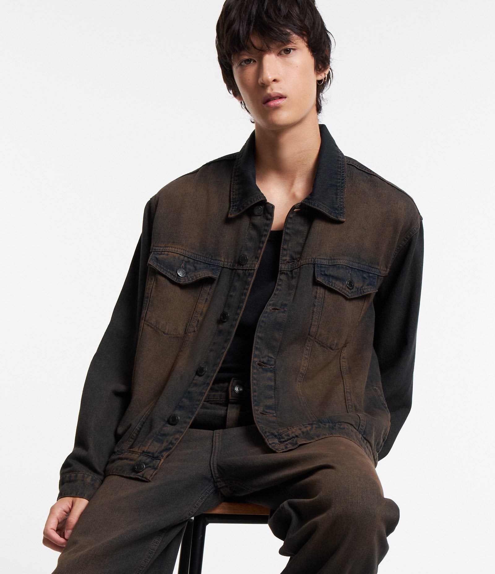 Jaqueta de brim azul escuro com lavagem suja para caminhoneiros