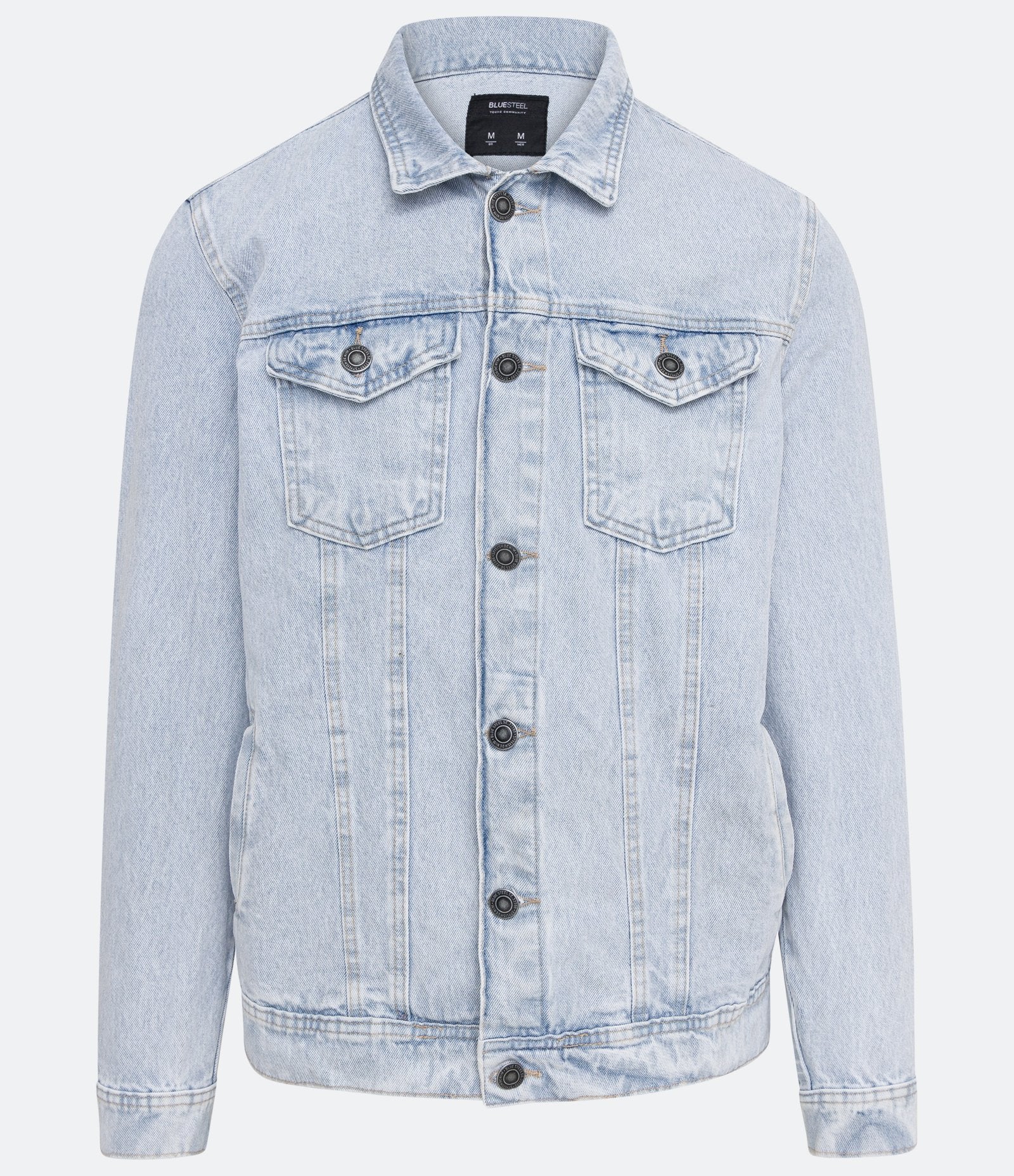 Jaqueta de brim azul claro com bolsos frontais e detalhes de costura