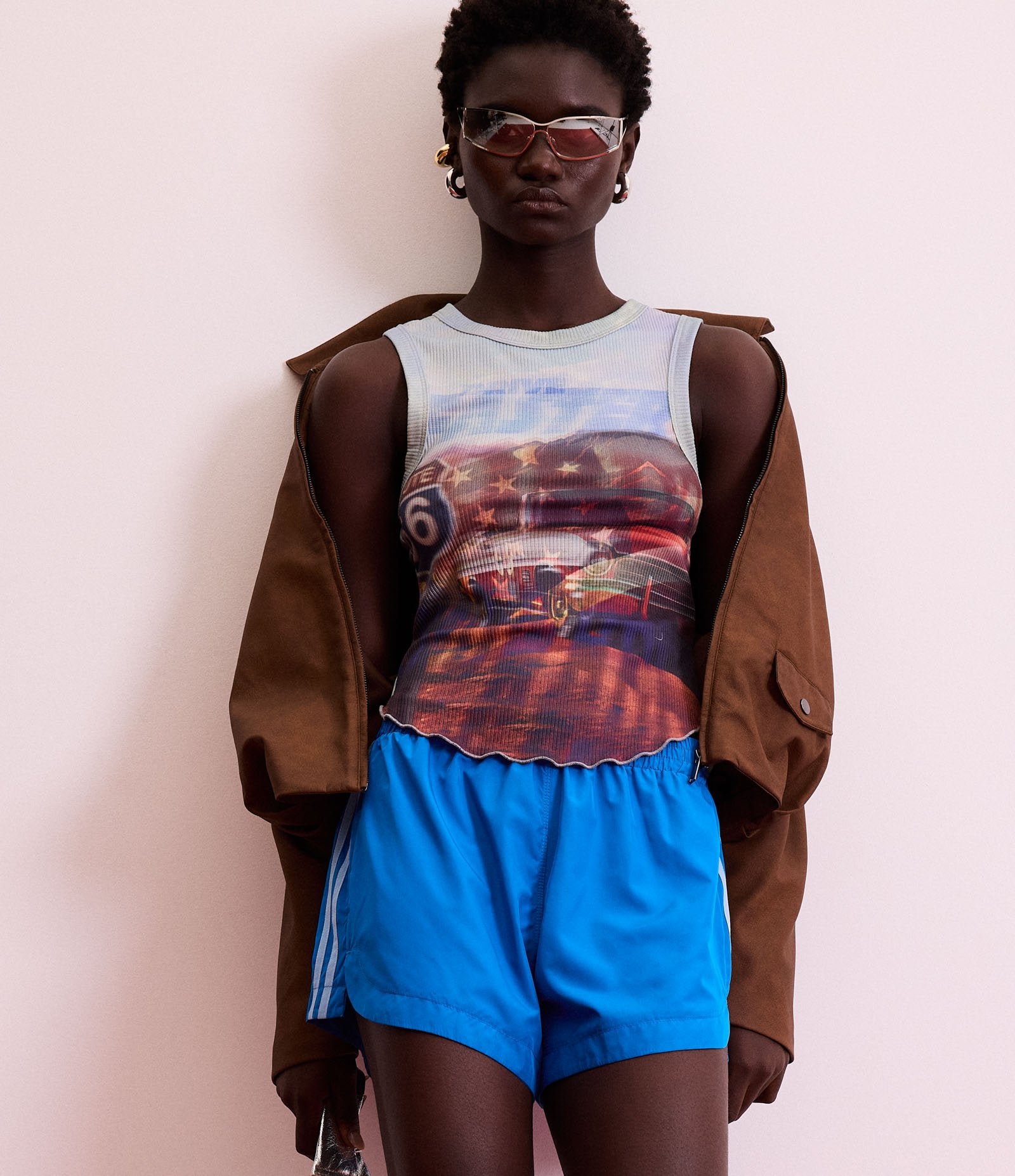 Regata Racerback em Tecido Canelado com Estampa Fotográfica Azul