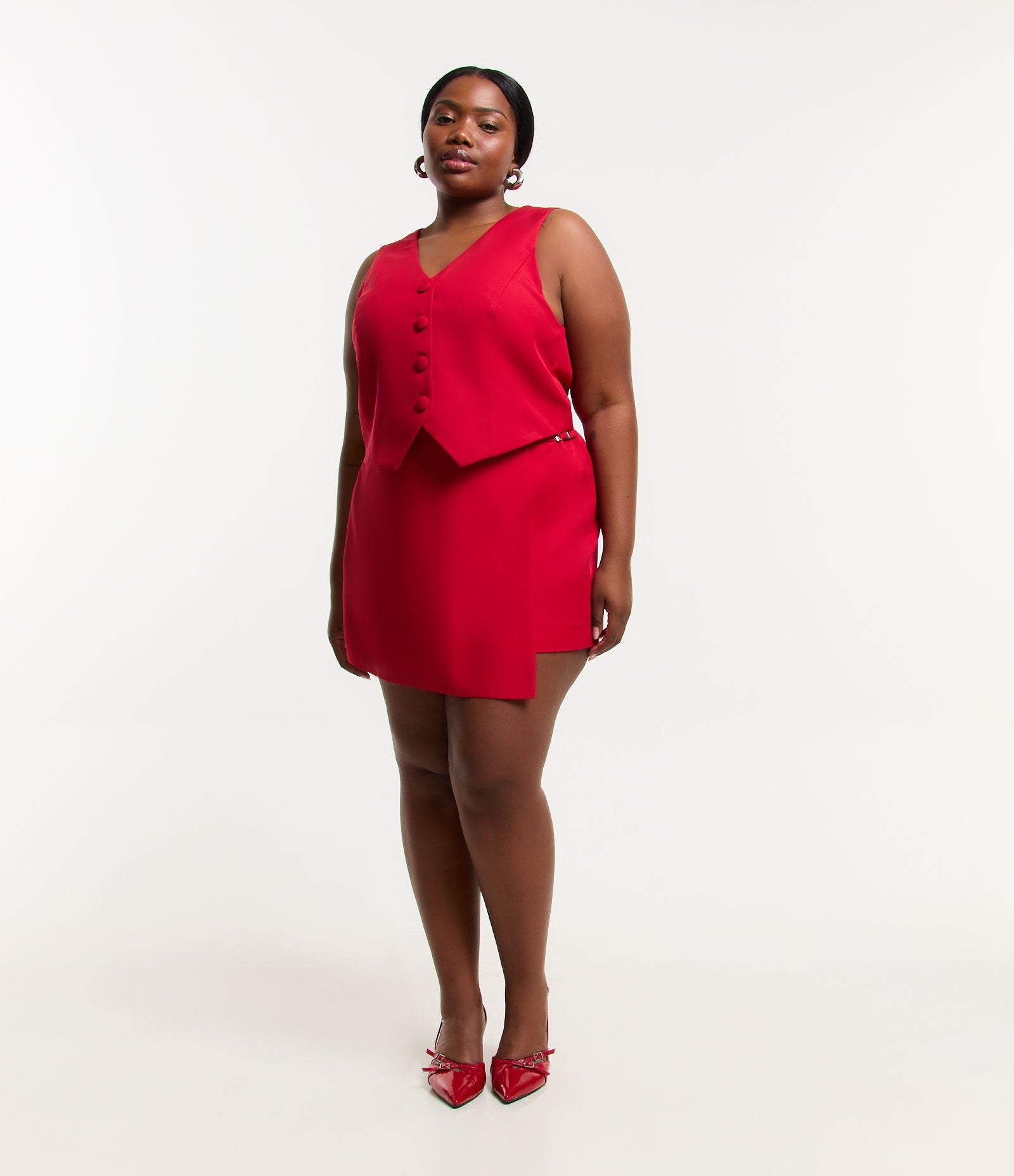 A saia curta de alfaiataria com fivela lateral em Curve & Plus Size Red da Ashua Curve foi criada para celebrar as curvas com estilo e confiança. Ideal para qualquer ocasião, essa peça combina perfeitamente conforto e elegância em um design lisonjeiro.