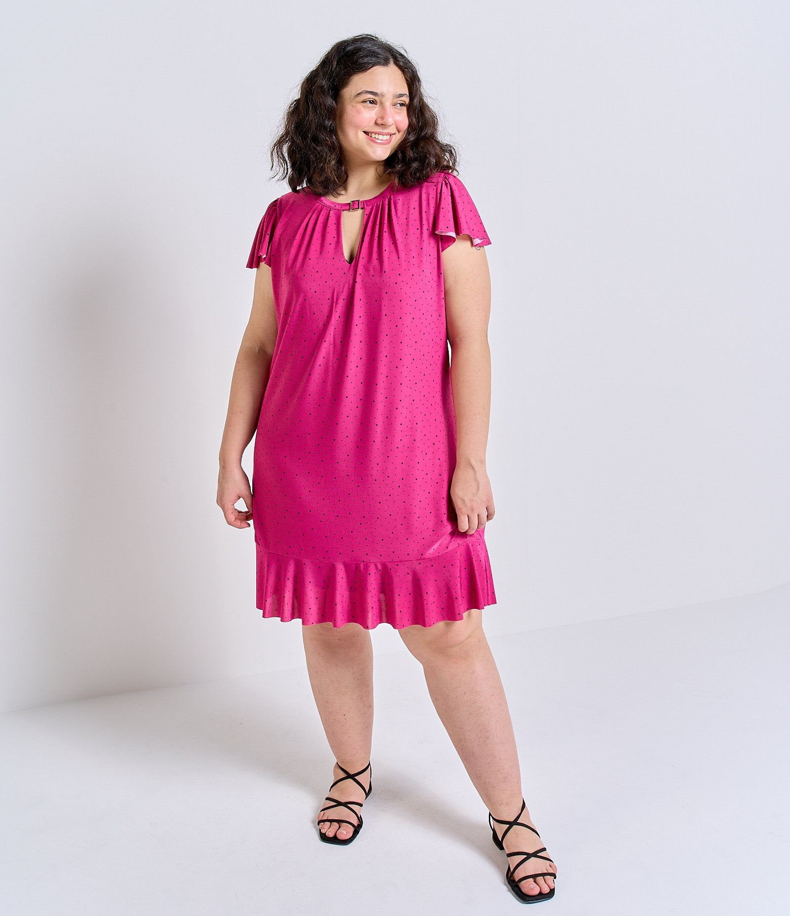 Vestido de bolinhas rosa com detalhe de fivela no decote - Curve e Plus Size