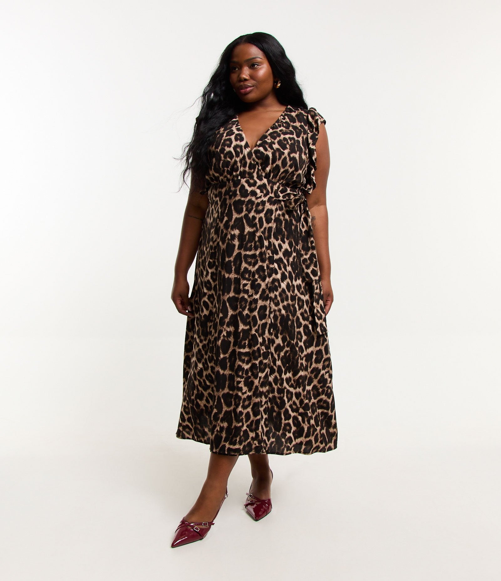 Vestido Midi Wrap em viscose com estampa animal e mangas com babados Curve & Plus Size Black