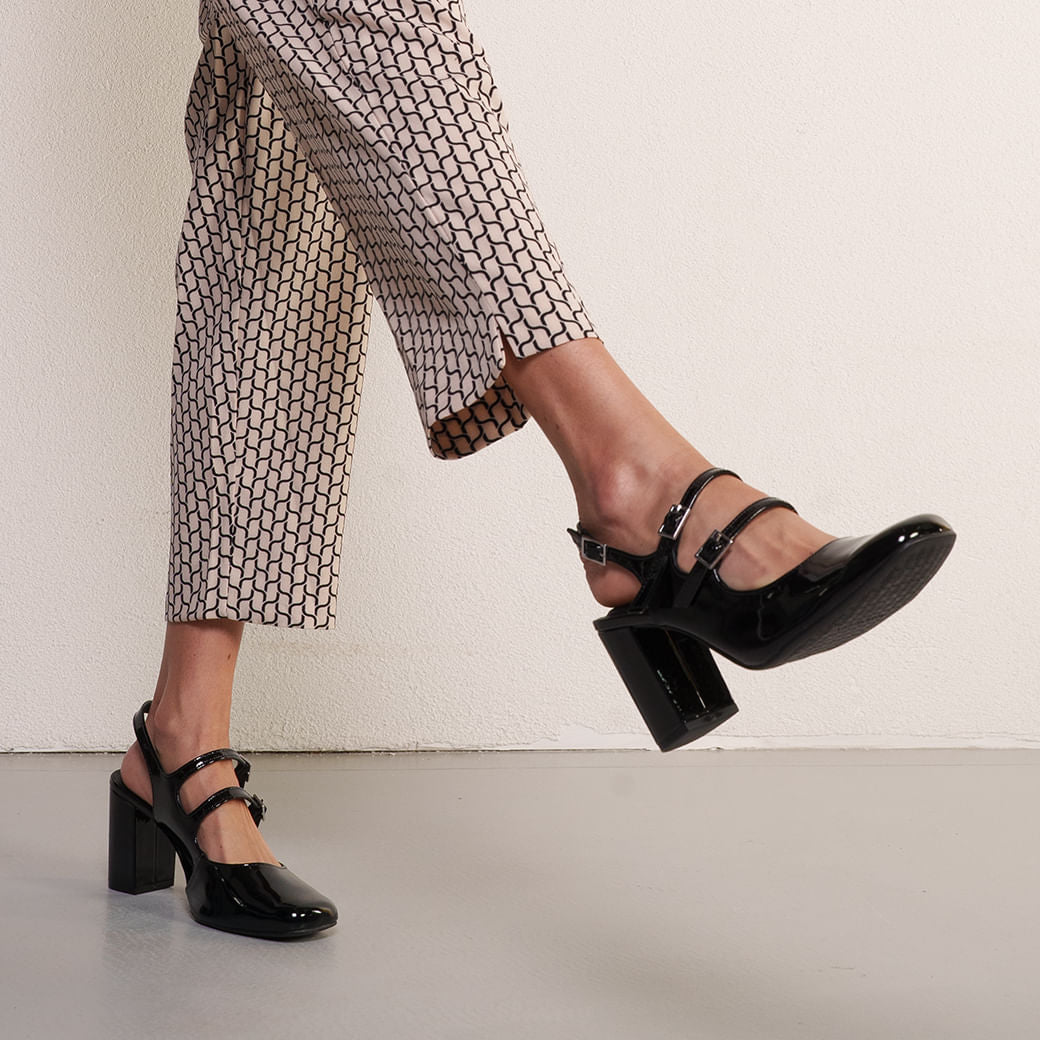 Sandálias femininas com tiras de verniz preto e fivela da Via Marte