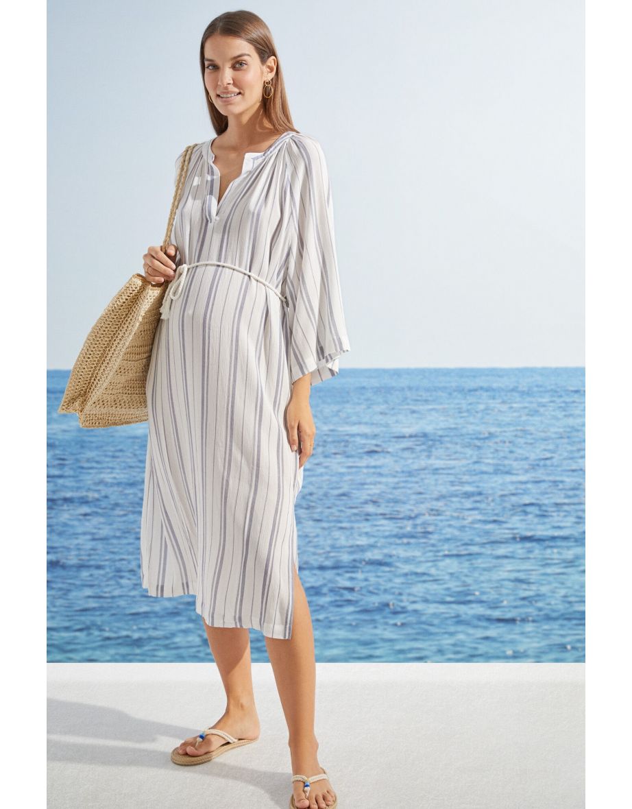 O vestido listrado azul-marinho 'Maternity' da Women'Secret é a escolha perfeita para um visual chique e cotidiano. Projetado para proporcionar conforto e estilo, ele é um complemento essencial para qualquer guarda-roupa de maternidade.